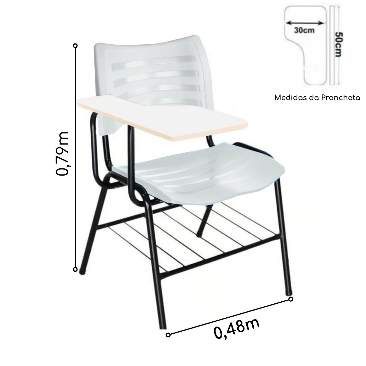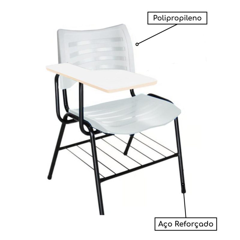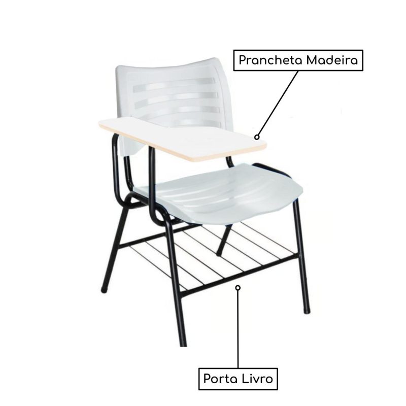 Mais informações: Prancheta em madeira, Assento e encosto em polipropileno, Base de aço com pintura eletrostática (montável), Porta Livros.