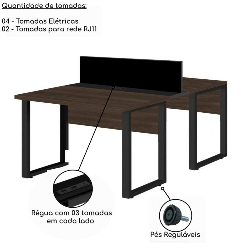 Estação de Trabalho Dupla 1,20×1,35m 02 Lugares c/ Gavetas c/ ponto de tomada PÉ QUADRO MARSALA/PRETO – 64001