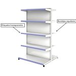 Mais informações: Gôndola Inicial, Porta Etiqueta Transparente, Pintura eletrostática, Bandejas reguláveis, Pés níveladores de altura